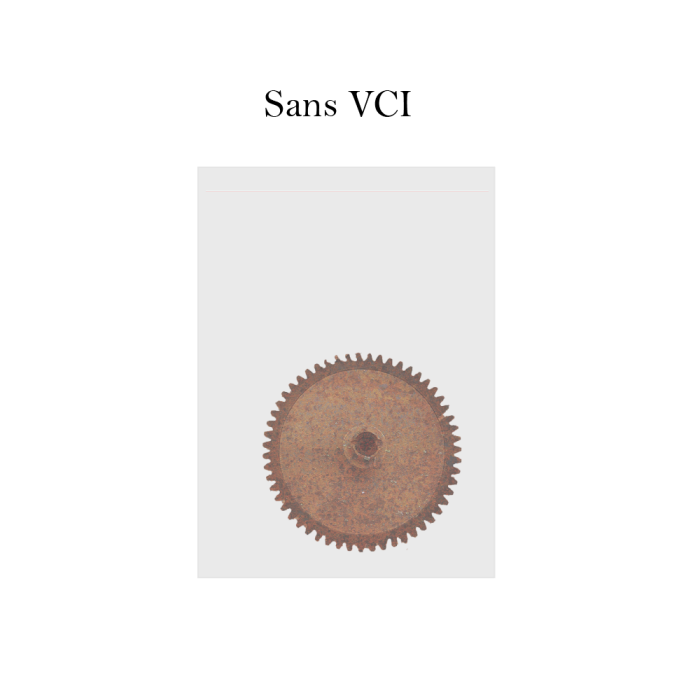 Au moment de la fermeture de l’emballage, les pièces doivent être, propres et sèches, exemptes de tout résidu empêchant la diffusion du VpCI à la surface du métal et pouvant générer de la corrosion. Veillez en particulier à éliminer :